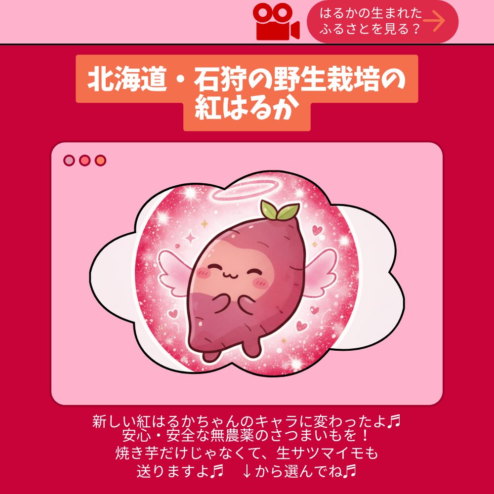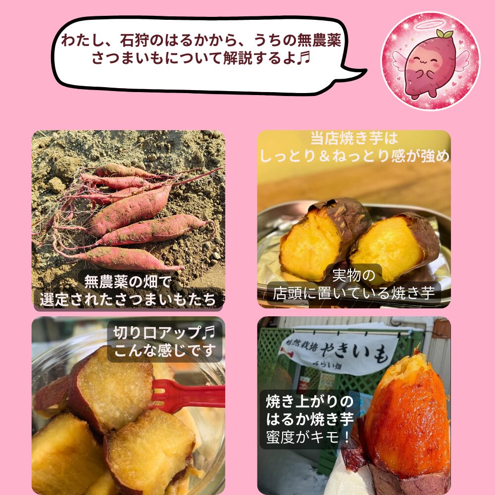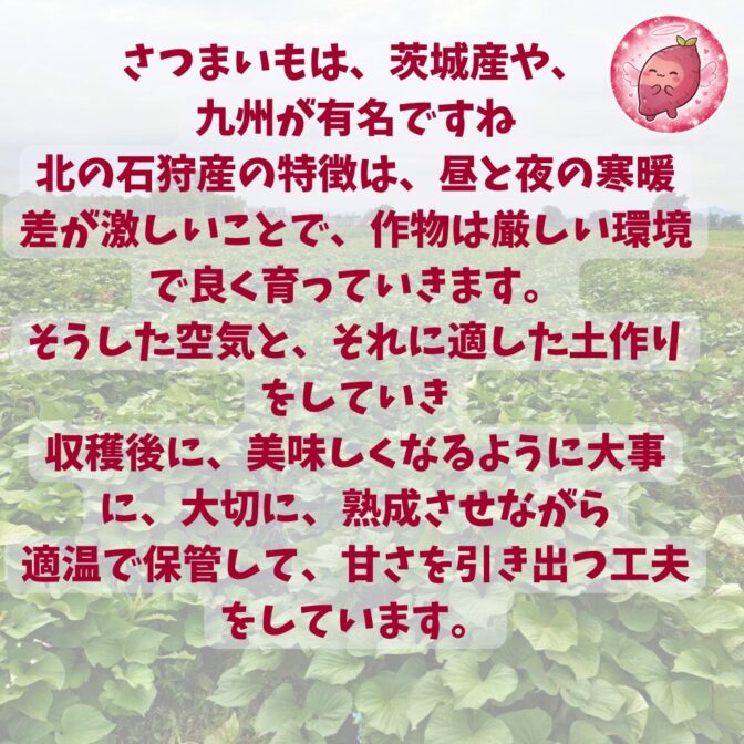 石狩生振産の紅はるかを使用しています! <私たち自らが育てた、地元産愛情たっぷりのサツマイモを使っています。> ・無農薬・無肥料だから、皮も安心して食べられます。